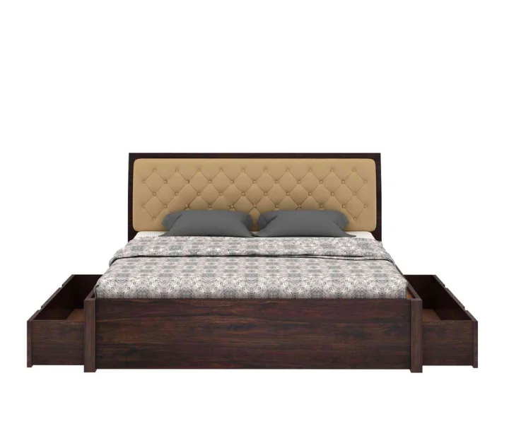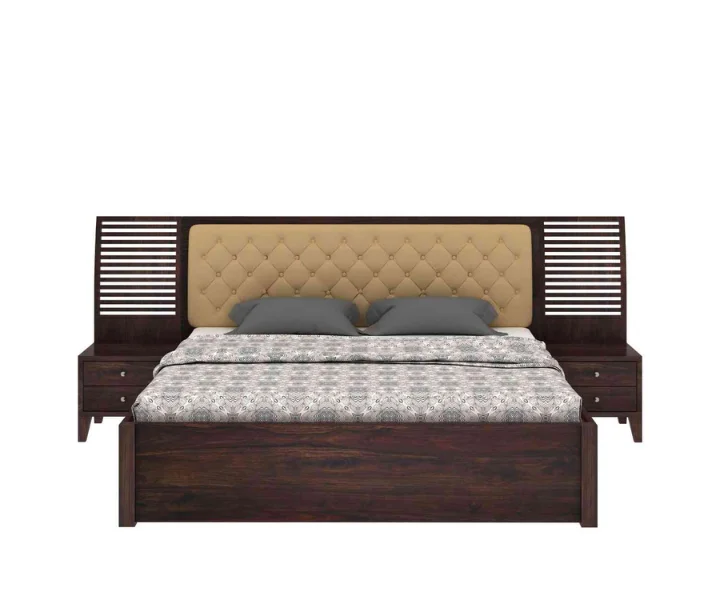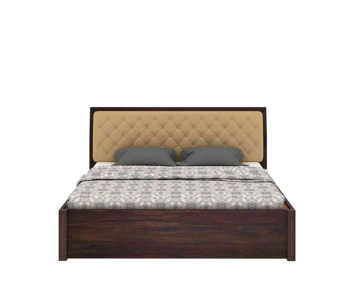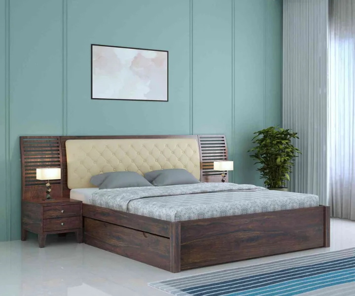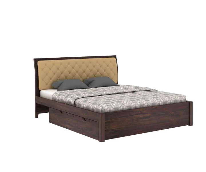 The bed in the image showcases a robust Sheesham wood frame with a rich brown finish.