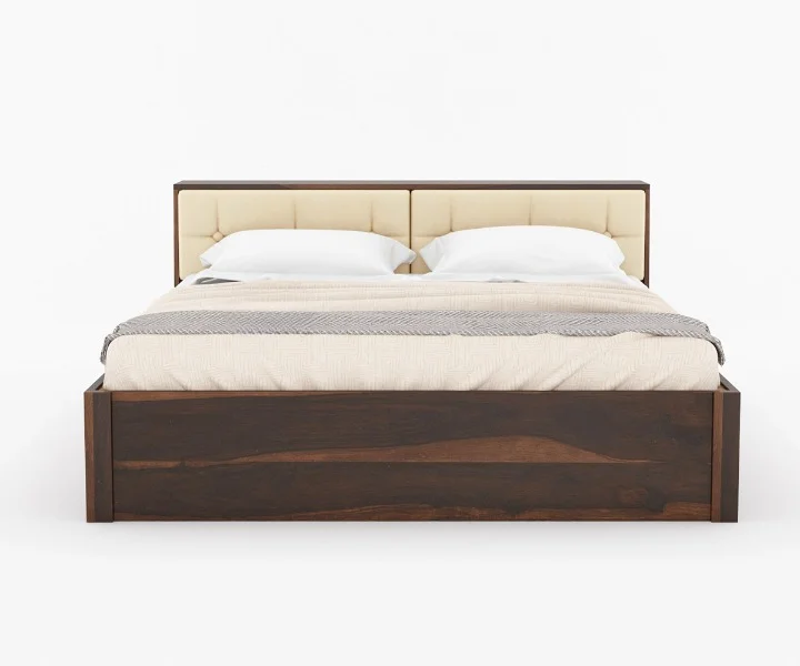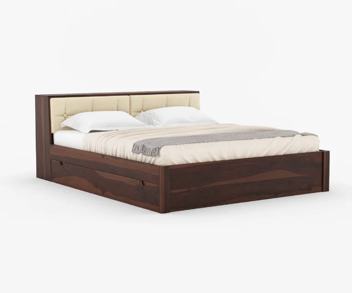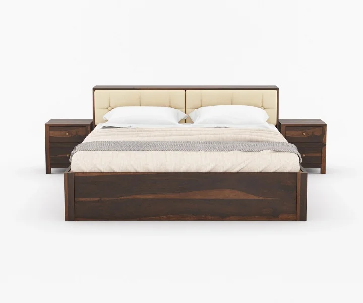 The bed in the image showcases a robust Sheesham wood frame with a rich brown finish.
