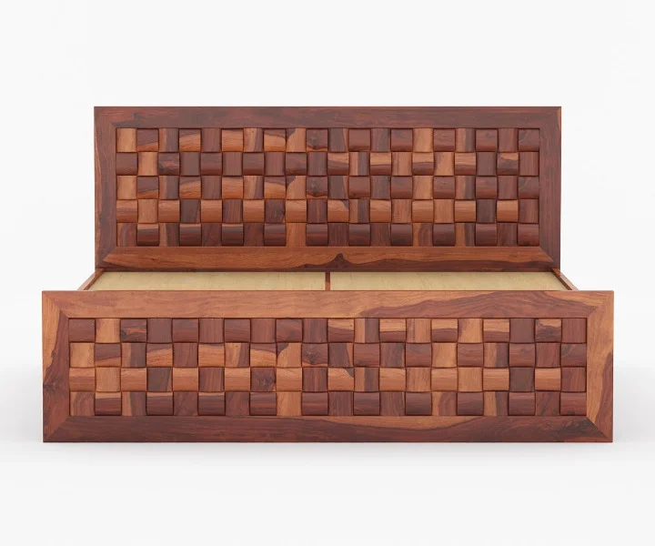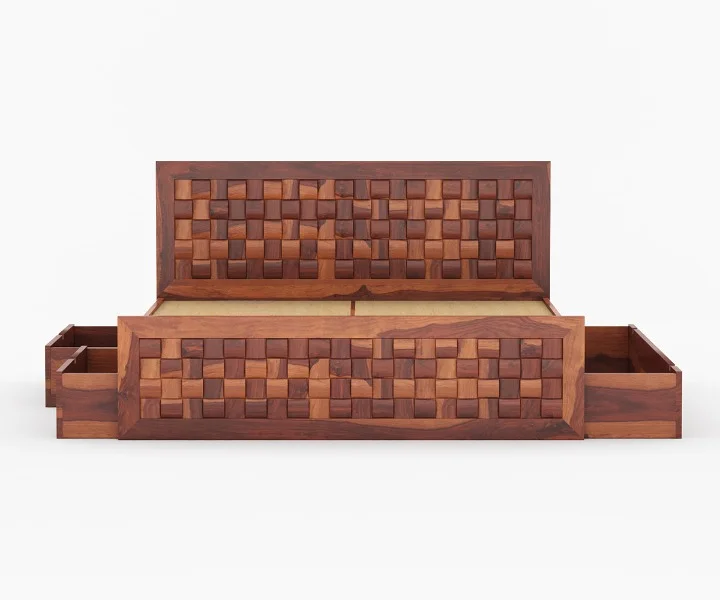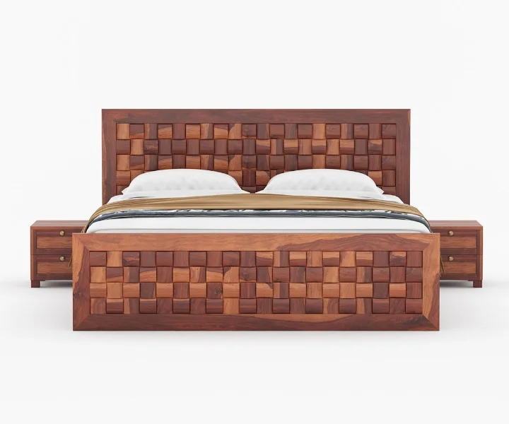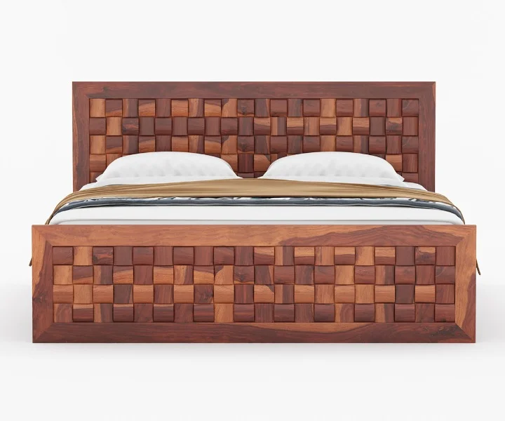 The bed in the image showcases a robust Sheesham wood frame with a rich brown finish.